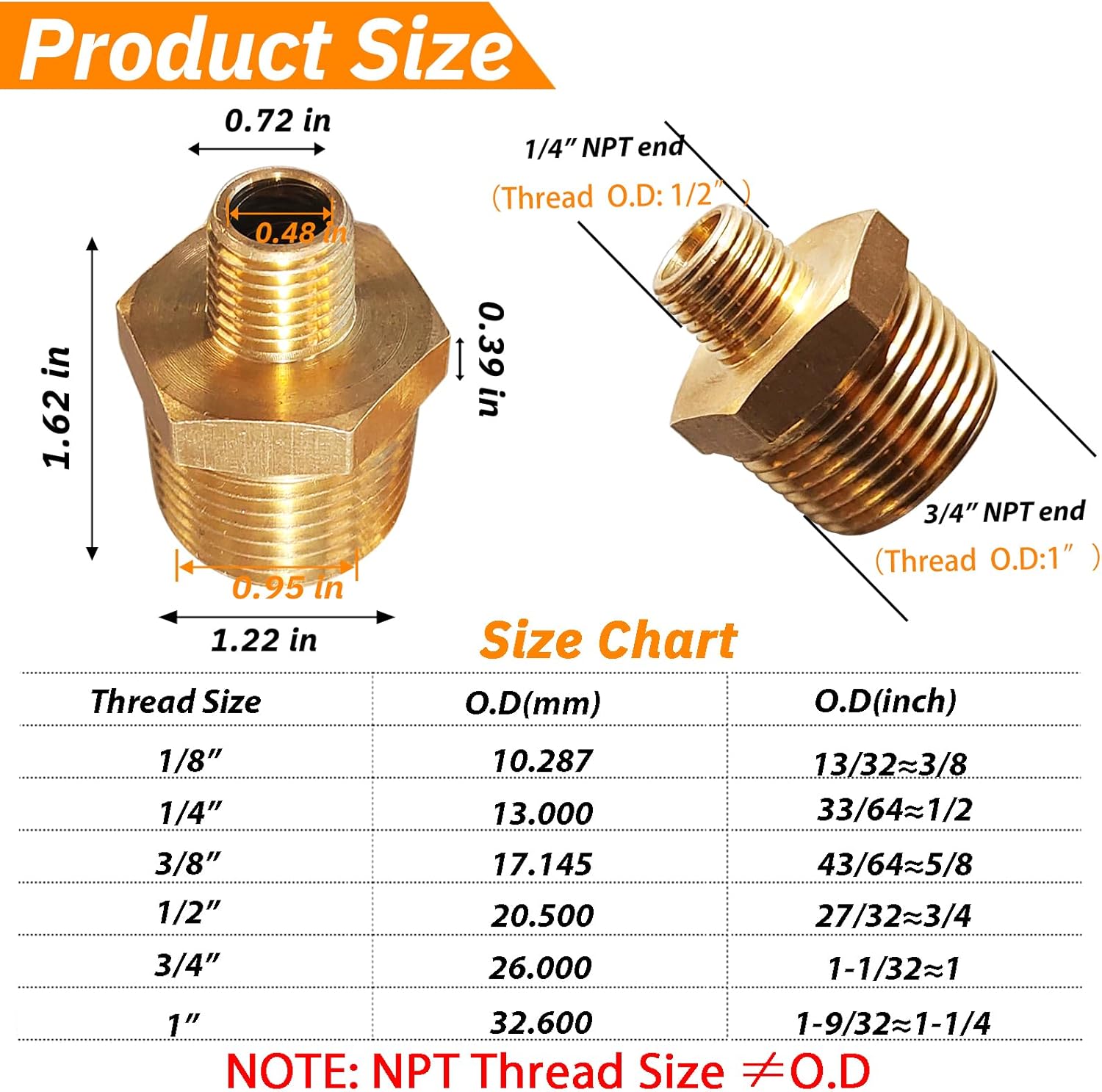 The Gadoutcover brass reducers come in multiple size combinations including 1/2 NPT x 1/4 NPT, 3/4 NPT x 1/2 NPT, 1/2 NPT x 3/8 NPT, 3/4 NPT x 1/4 NPT, and 1/4 NPT x 1/8 NPT. Each option includes 2 pieces of the specified size combination.
